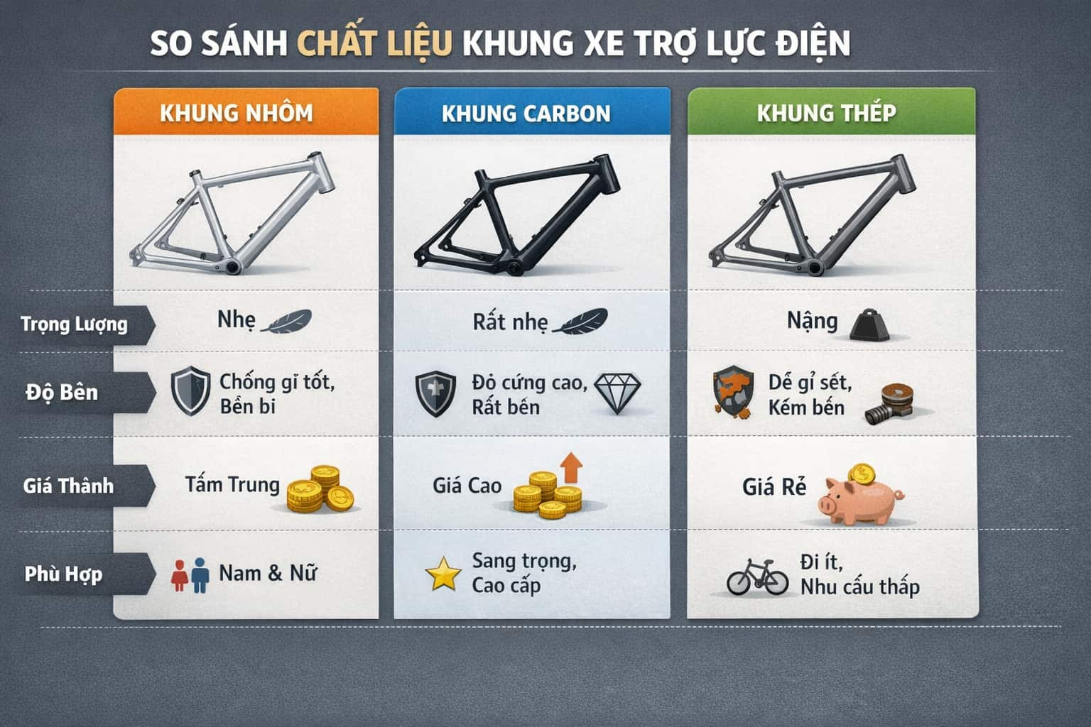 Khi lựa chọn xe đạp điện trợ lực, vật liệu khung cũng là yếu tố quyết định độ bền, trọng lượng và trải nghiệm vận hành. Để có thể lựa chọn loại khung phù hợp với mục đích di chuyển của mình các bạn có thể tham khảo thêm bảng so sáng các chất liệu khung xe dưới dây