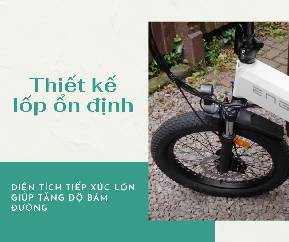 Sở hữu thiết kế lốp béo 20x3 inch, chiếc xe mang đến cảm giác lái êm ái hơn hẳn – ngay cả trên các địa hình gồ ghề. Lốp có diện tích tiếp xúc lớn, giúp tăng độ bám đường, nâng cao độ ổn định và an toàn khi vận hành