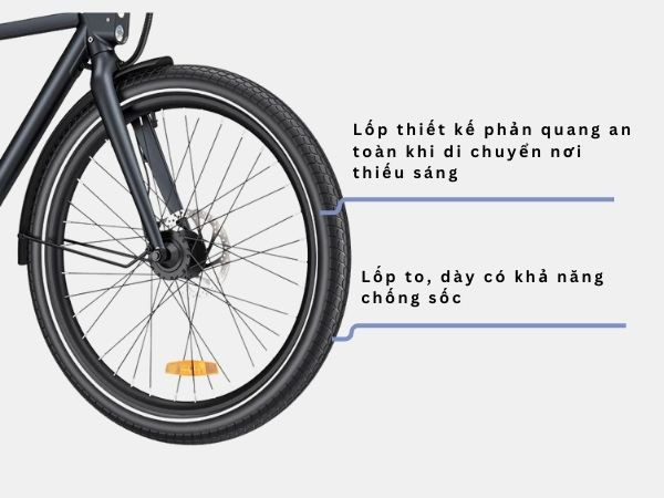 Kích thước bánh xe của P275 Pro có phần nhỉnh hơn so với các mẫu xe trước đây. Với kích thước lốp là 27*5 khá to và dày có khả năng chống sốc giúp bạn di chuyển êm ái khi đi trên đường gồ ghề hoặc bề mặt không bằng phẳng. Đặc biệt lốp có phản quang giúp tăng khả năng hiển thị trong điều kiện ánh sáng yếu.