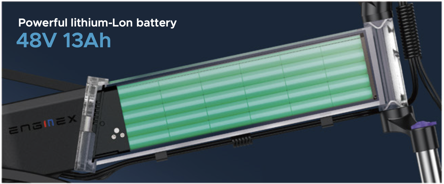 Pin của xe đạp điện trợ lực Engwe là dòng pin thế hệ mới nhất hiện nay Lithium ion. Pin có tuổi thọ cao và mật độ năng lượng lớn hơn nhiều so với ắc quy, do đó pin có thể tăng thời lượng lên khá cao và giảm trọng lượng một cách đáng kể.