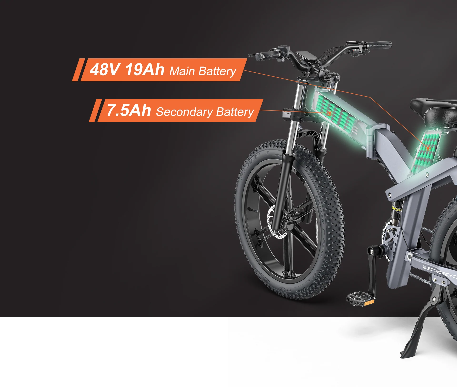 Trái tim của chiếc xe, nó cung cấp toàn bộ năng lượng cho động cơ và bộ điều khiển. Được bảo vệ an toàn trong thân xe, và việc tháo rời cũng vô cùng dễ dàng. Đa phần dung tích của những viên pin này sẽ dao động trong khoảng 36V-10Ah cho tới 48V-19Ah, tuy nhiên cũng có những ngoại lệ như Engwe X26 với 2 viên pin cực khủng.