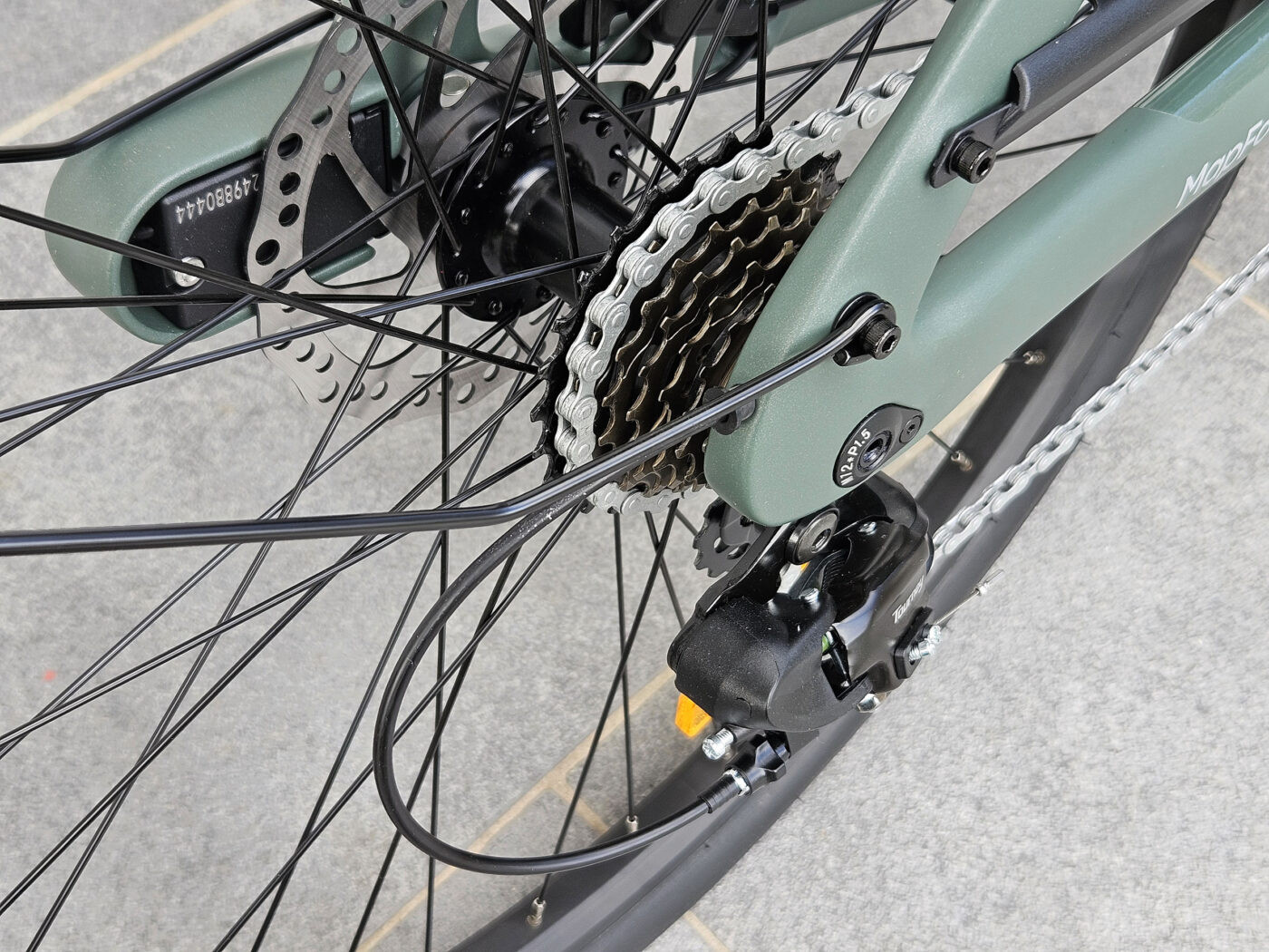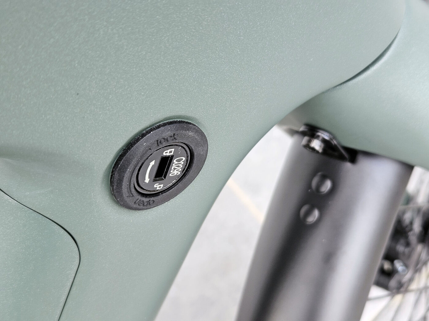 Khung có hai màu: xanh lá cây đậm và xám. Toàn bộ xe nhẹ hơn hầu hết các xe đạp điện.