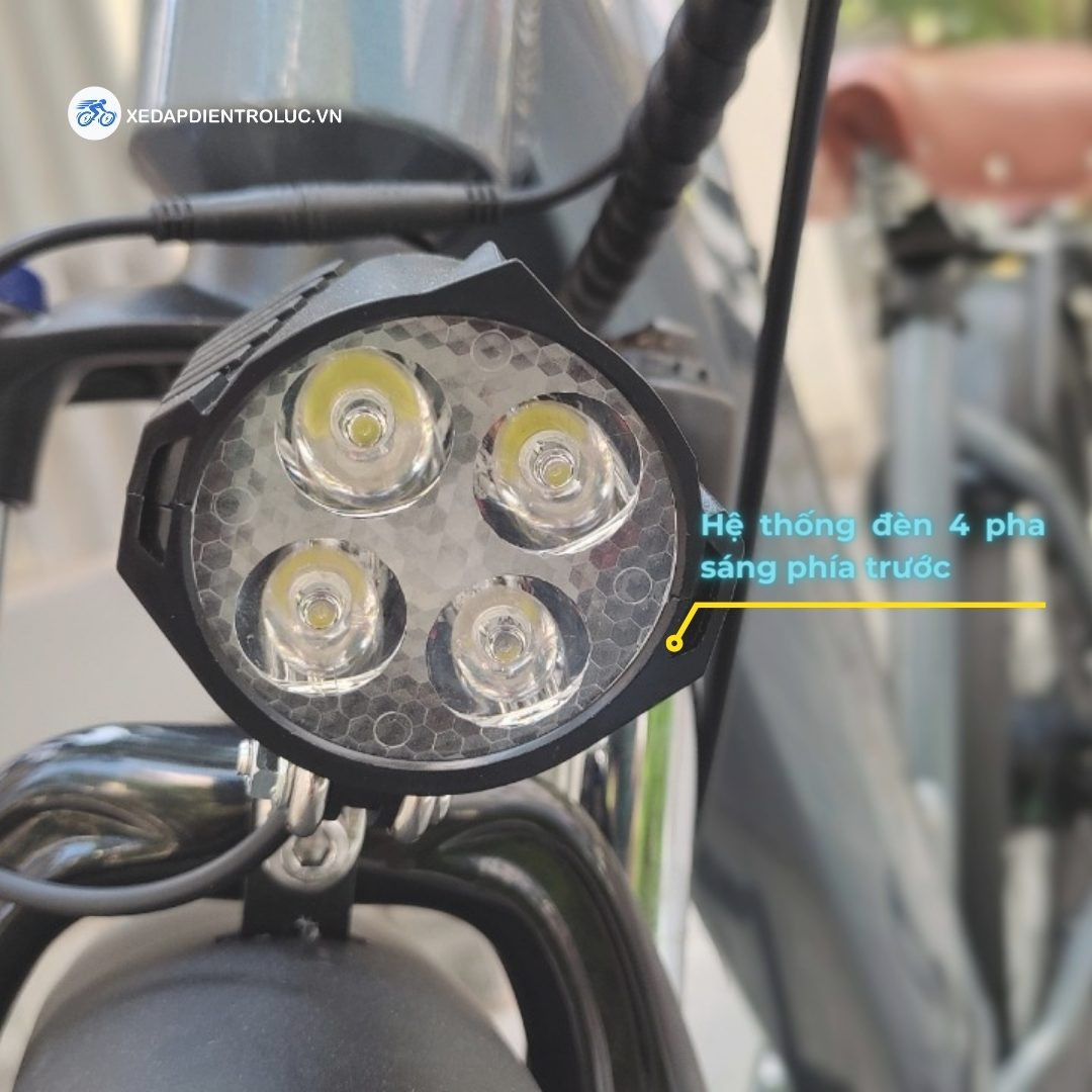 Trang bị hệ thống đèn 4 pha cực sáng giúp di chuyển an toàn, dễ dàng nhìn thấy các chướng ngại vật vào lúc trời tối. Ngay phía dưới tay lái bên phải được tích hợp còi cảnh báo thuận với tay cầm giúp việc thao tác được dễ dàng hơn